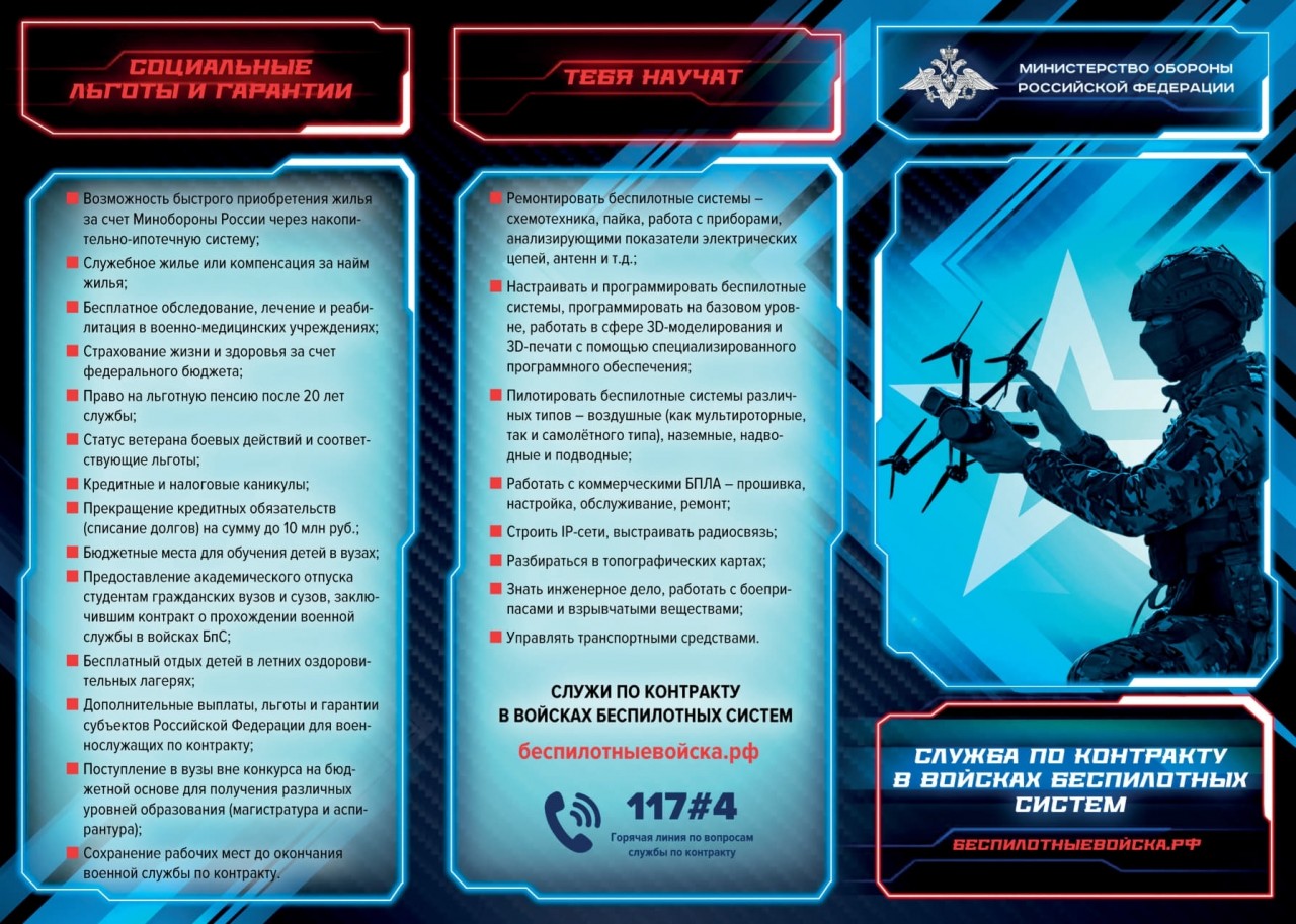 Для вступления Войска беспилотных систем по контракту звоните на горячую линию 117 (затем нажмите 4) или обращайтесь в военный комиссариат. Также можно воспользоваться общим телефоном Министерства обороны РФ 8-800-707-99-99.